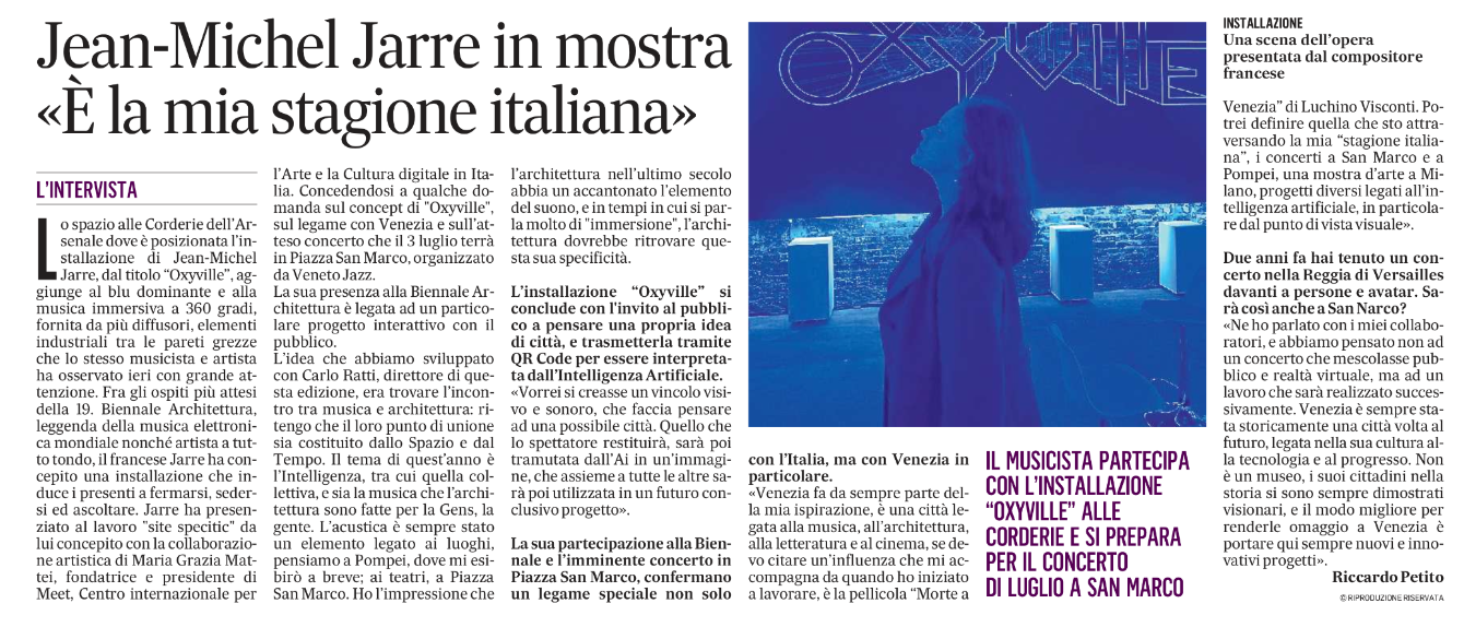 Interviste a Jean-Michel Jarre a Venezia, per un doppio appuntamento della leggenda della musica elettronica: un concerto in Piazza san Marco il 3 luglio 2026, e una originale installazione sonora dal titolo "Oxyville" all'interno della 19. Biennale Architettura.